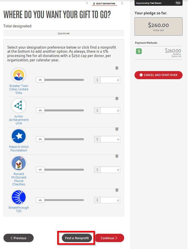 - Use the slide bar or type in the dollar amounts you'd like to go to your nonprofit choices and Click "Continue"