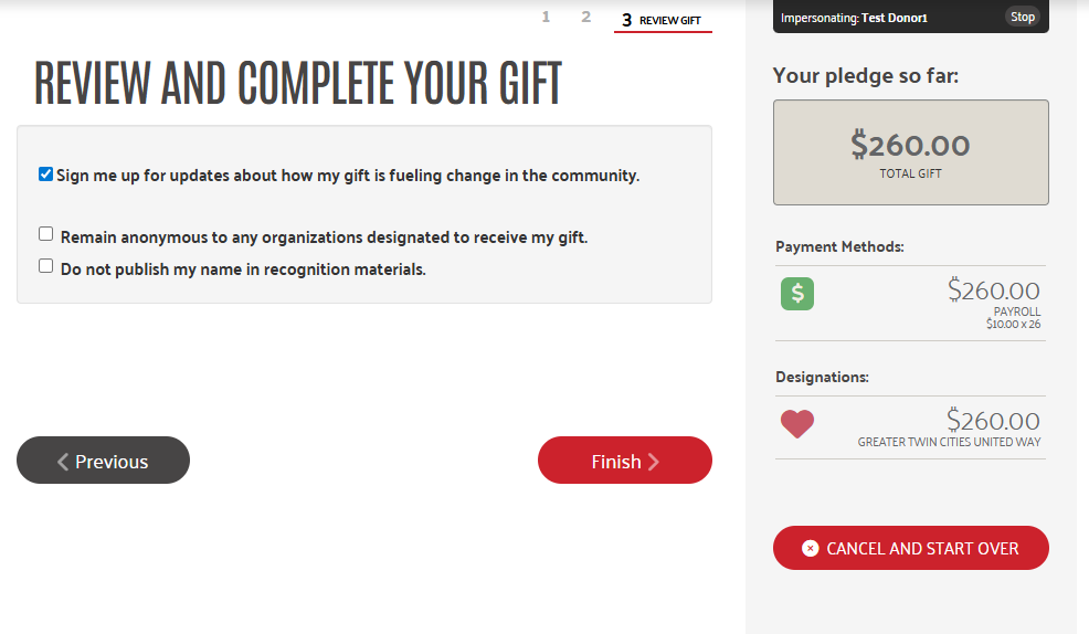 - You'll have a chance to Review your gift and can choose an option if you want your contact information to be anonymous in publications or to your designated non-profits. Click "Finish"